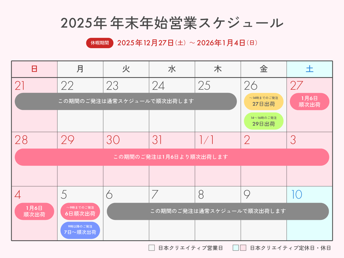 休暇期間中にいただきましたご発注につきましては、2026年1月6日(火)より順次対応いたします。