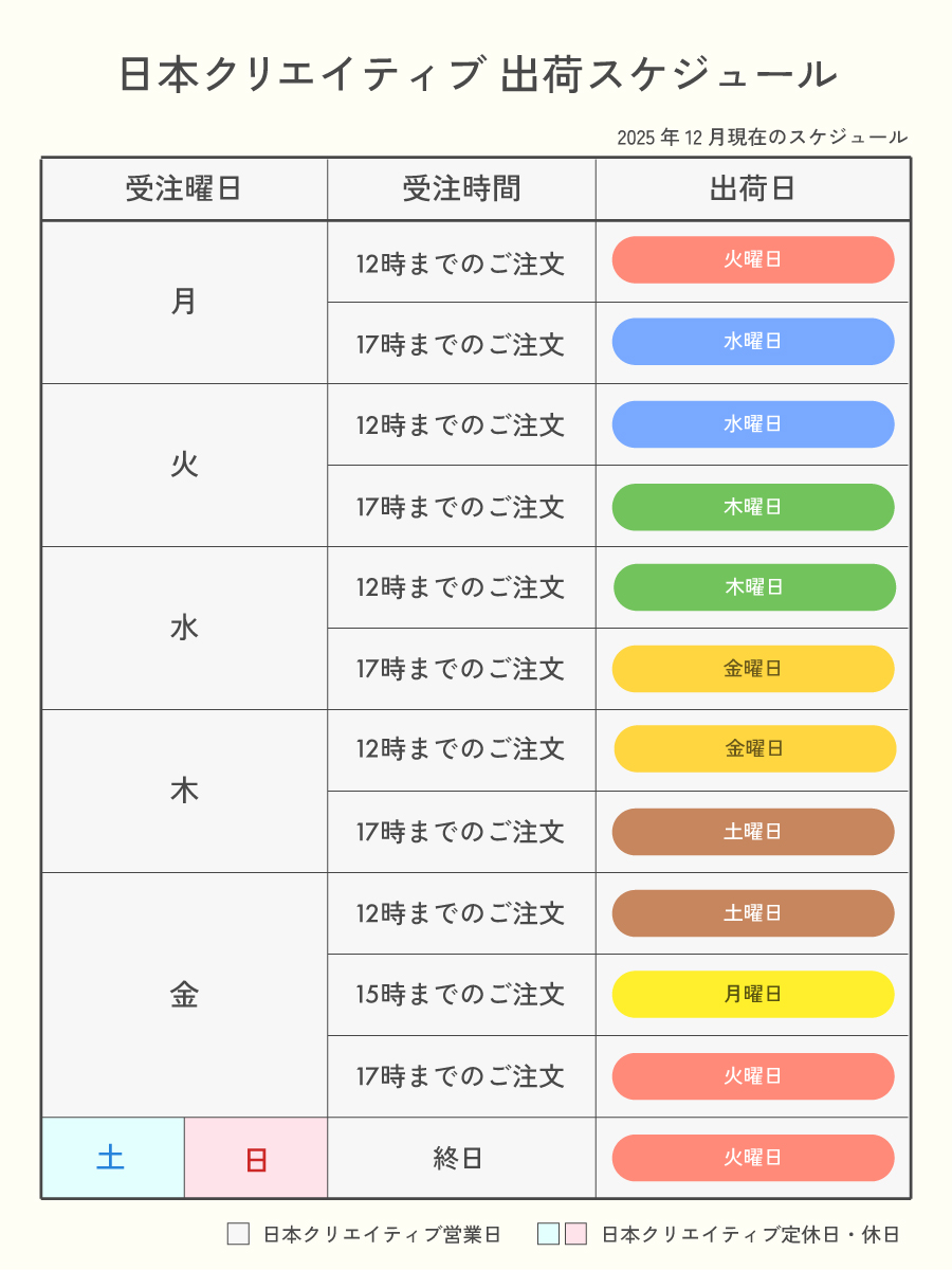 GWやお盆休み等の長期休みの前のお届けをご希望の場合は、余裕をもってご注文いただけますと幸いです。